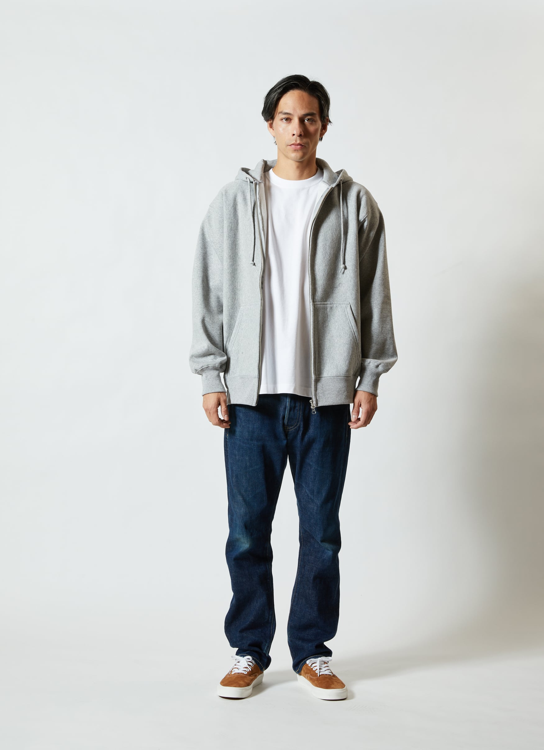 オープンエンド糸特有のドライな質感が特徴の12.0オンス裏起毛フルジップパーカ。生地目を横取りしたサイドパネルはリブ仕様のため型崩れしにくく、着れば着るほど独特の風合いとエイジングを楽しめます。絶妙に計算された袖のルーズなシルエットもポイント。大きめサイズでざっくりした着こなしができます。